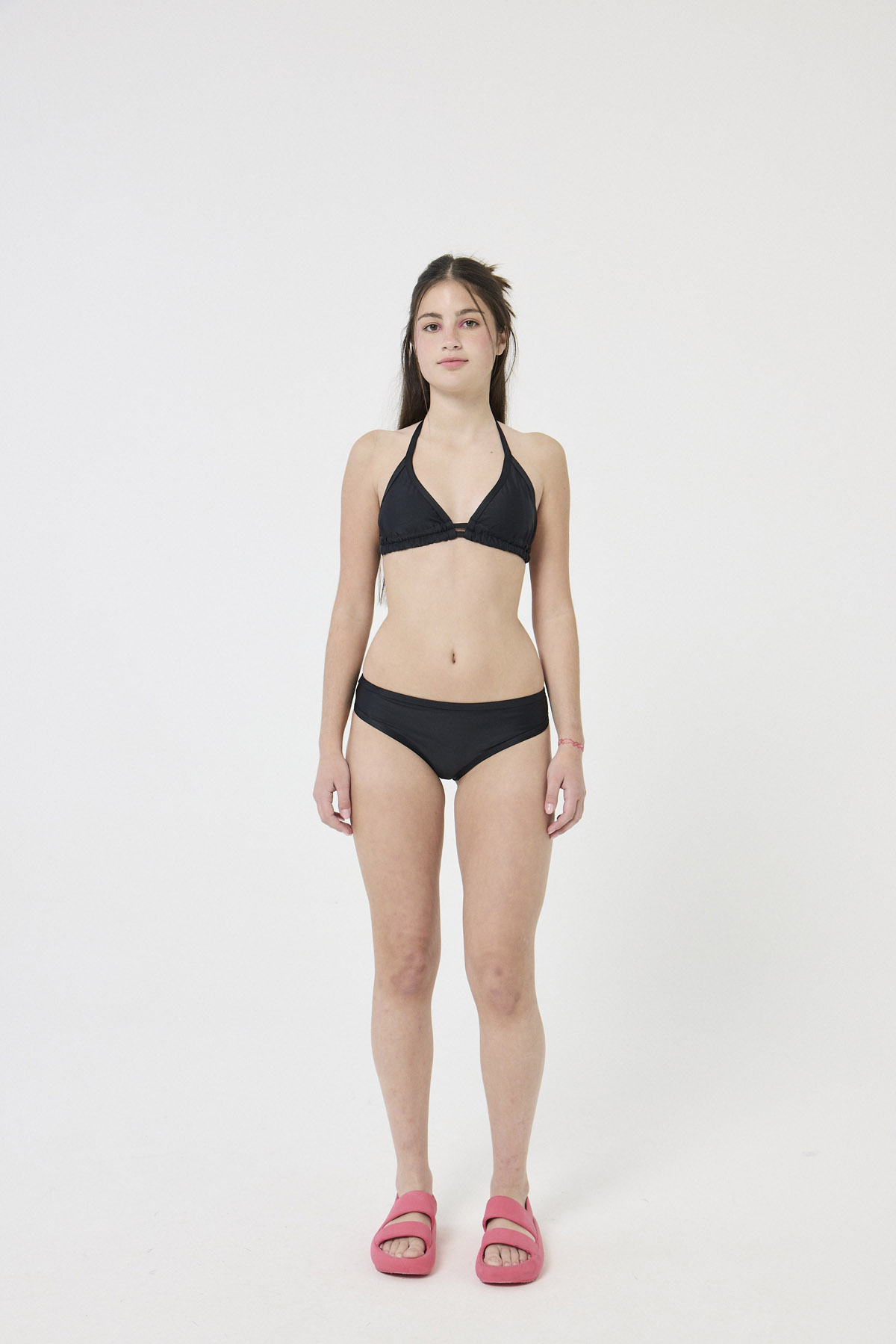 UN TRAJE DE BAÑO EN TRICOT DE 2 PIEZAS, CON CORPIÑO TRIANGULITO CON DOBLE PASADOR DE TIRA Y BOMBACHA CLÁSICA.