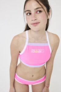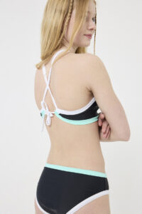 UN TRAJE DE BAÑO DE DOS PIEZAS CON CINTURA,SISAS Y ESCOTE A CONTRACOLOR. EL TOP VIENE CON DISEÑO EXCLUSIVO BORDADO EN EL FRENTE.