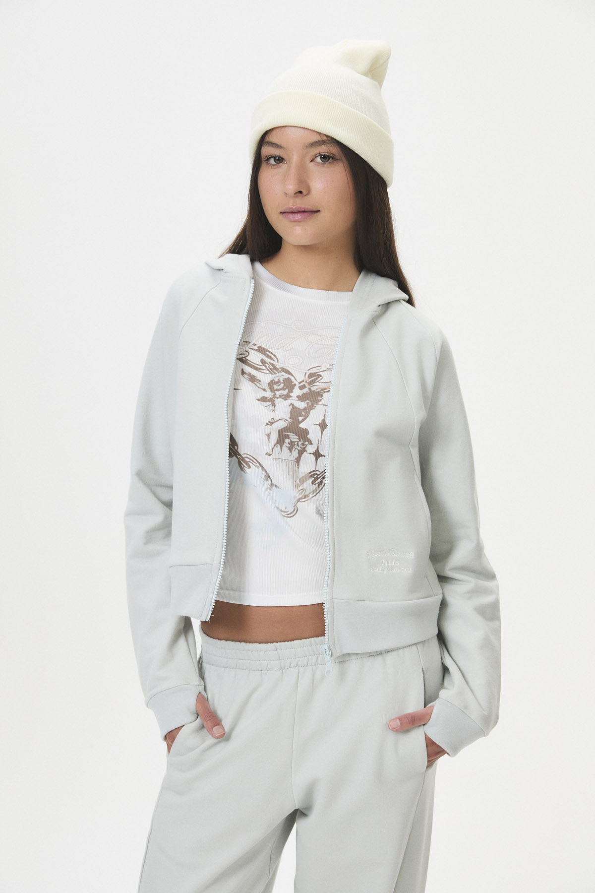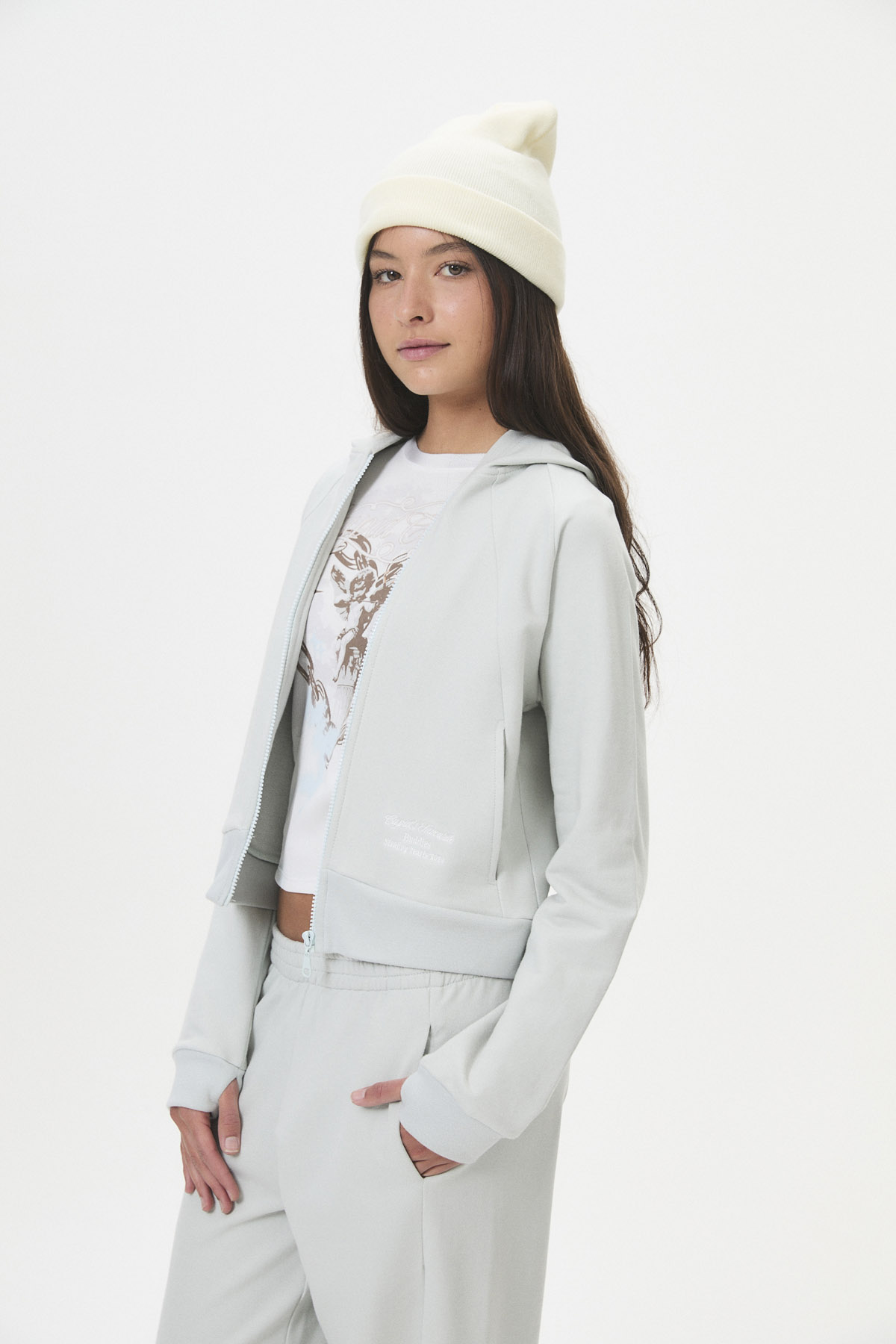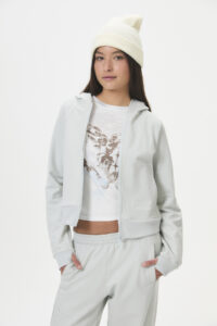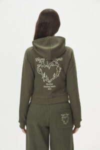 Esta prenda comfy y casual, ideal para el día a día, es parte de la cápsula “CUPID’S FAV”, inspirada en ese momento un poco vergonzoso y “girly” del primer enamoramiento. Confeccionada en frisa de 85% algodón y 15% poliéster, presenta un corte crop y entallado, con detalles como recortes decorativos, puños con abertura para pulgar y capucha. Los bordados en delantero y espalda reflejan el estilo tipográfico “varsity” de la cápsula. Disponible en curva de talles pares para un ajuste perfecto.