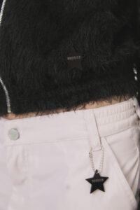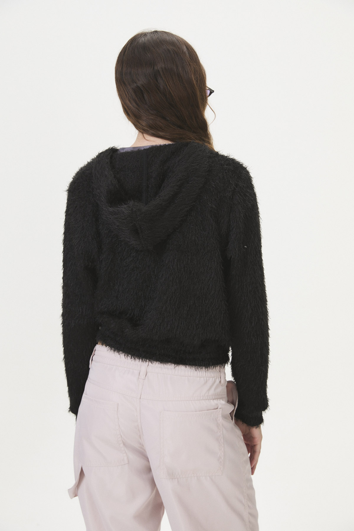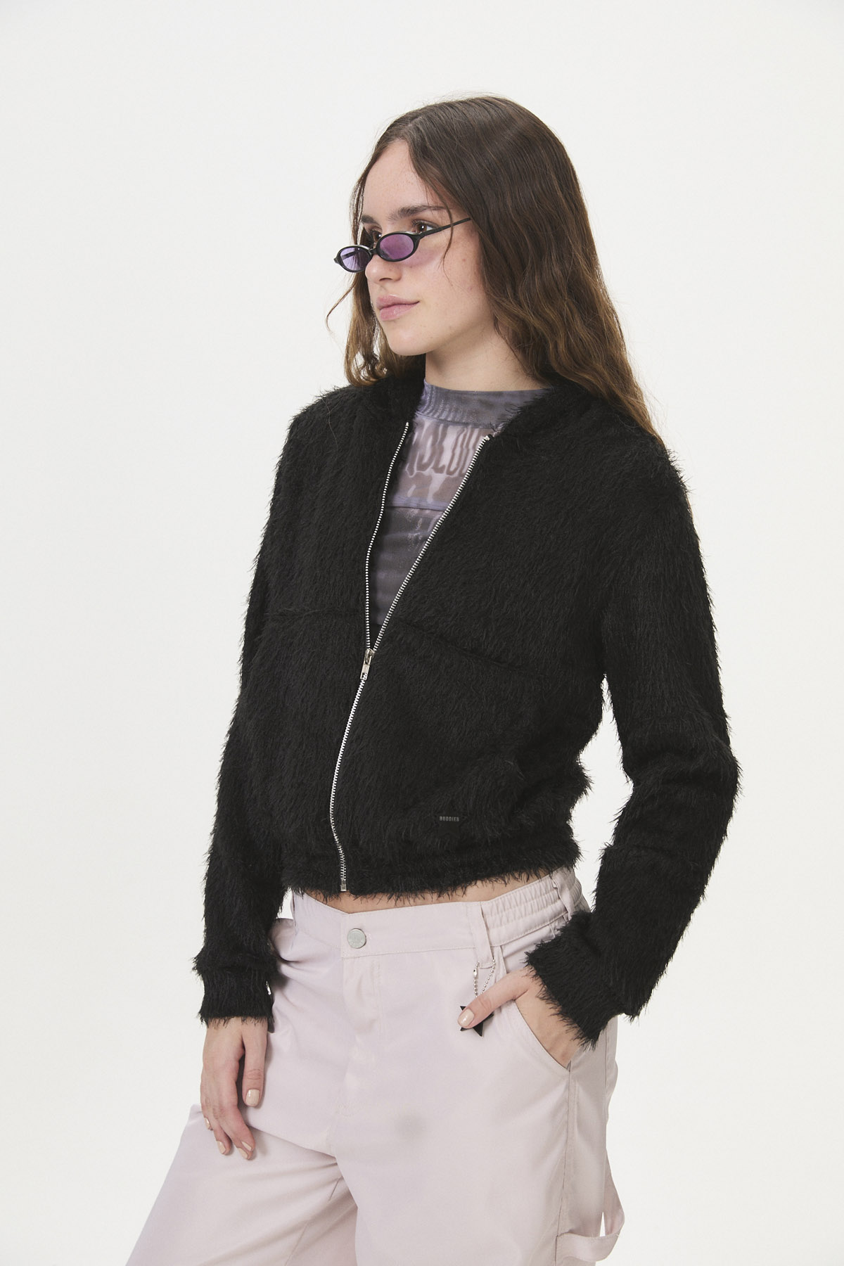Una prenda ideal para la media estación, con capucha y bolsillo canguro, confeccionada en una suave mezcla de pelo de mono (98% poliéster, 2% spandex). Forma parte de la cápsula “OUT OF CONTROL”, reflejando esa búsqueda de identidad y sensación de libertad en una etapa de transición. Perfecta para un look urbano o una salida, abarcando la curva de talles pares. El detalle de la tira cierre con forma de estrella le da un toque único y divertido a esta pieza.