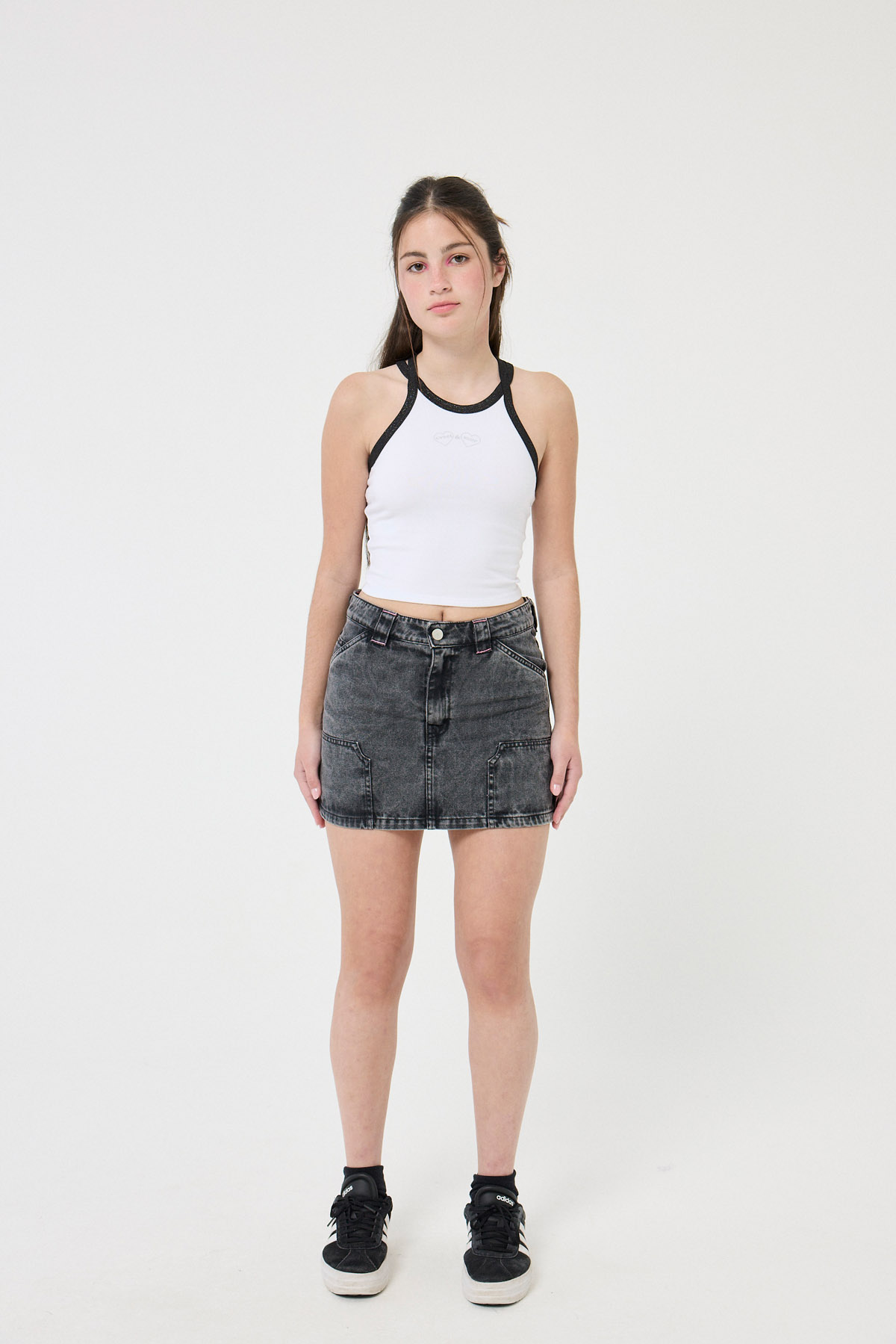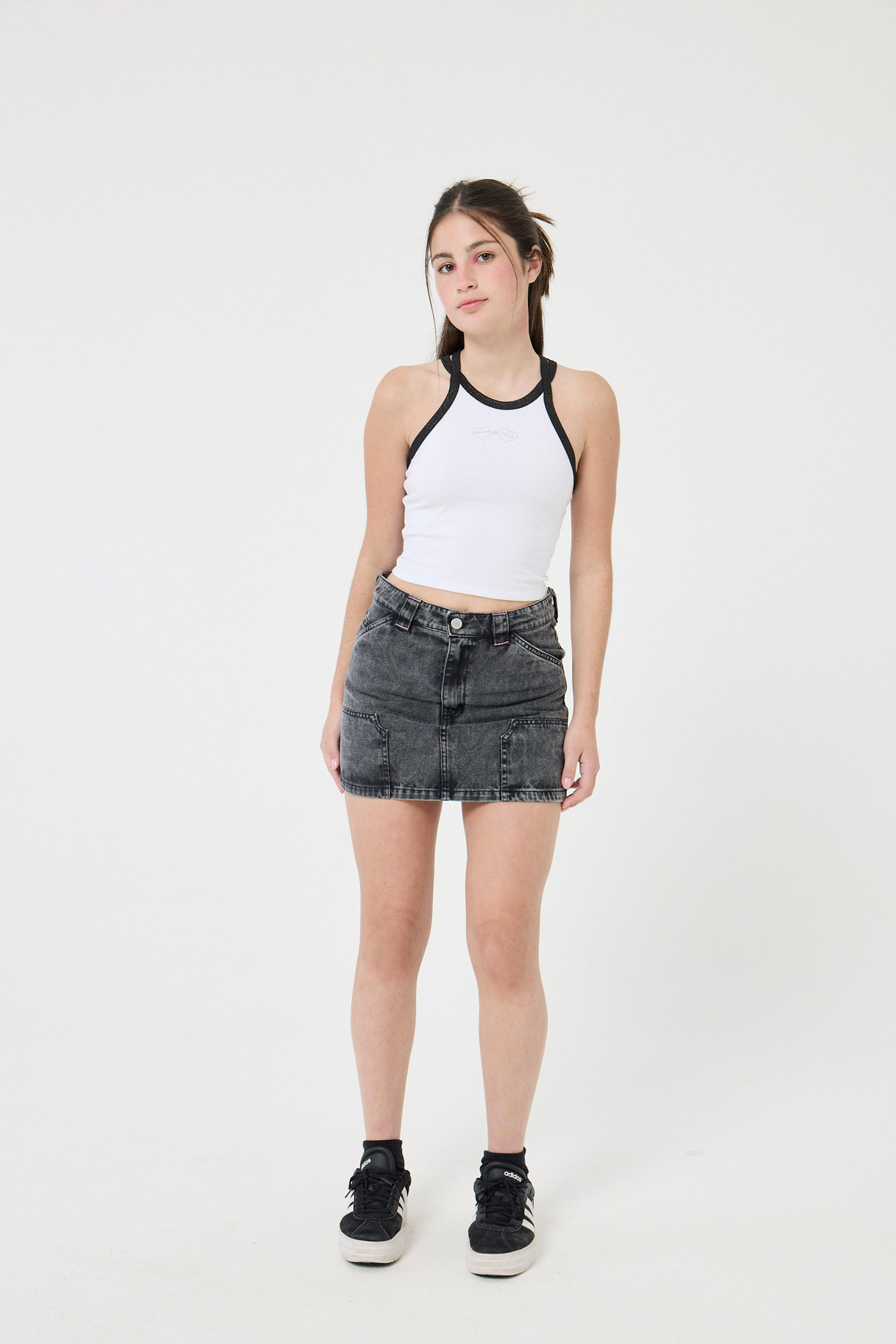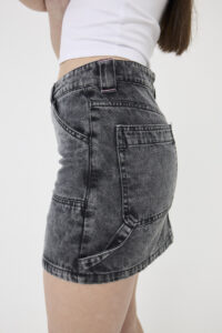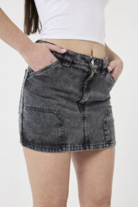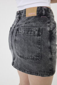 UNA MINI DE GABARDINA NEGRA CON BOLSILLOS DELANTEROS Y TRASEROS, LLEVA UN DETALLE DE ATRAQUES DE COLOR ROSA Y TIRILLA DE MARTILLO, CON REFUERZOS CARPINTEROS EN EL DELANTERO. LAVADO ACID, BADANA Y BOTÓN.