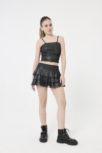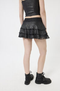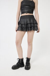 UNA FALDA EN MESH FOIL CON 3 CAPAS DE VOLADOS, LLEVA UNA CALZA CORTA INTERNA INCORPORADA EN JERSEY CON ELASTANO.