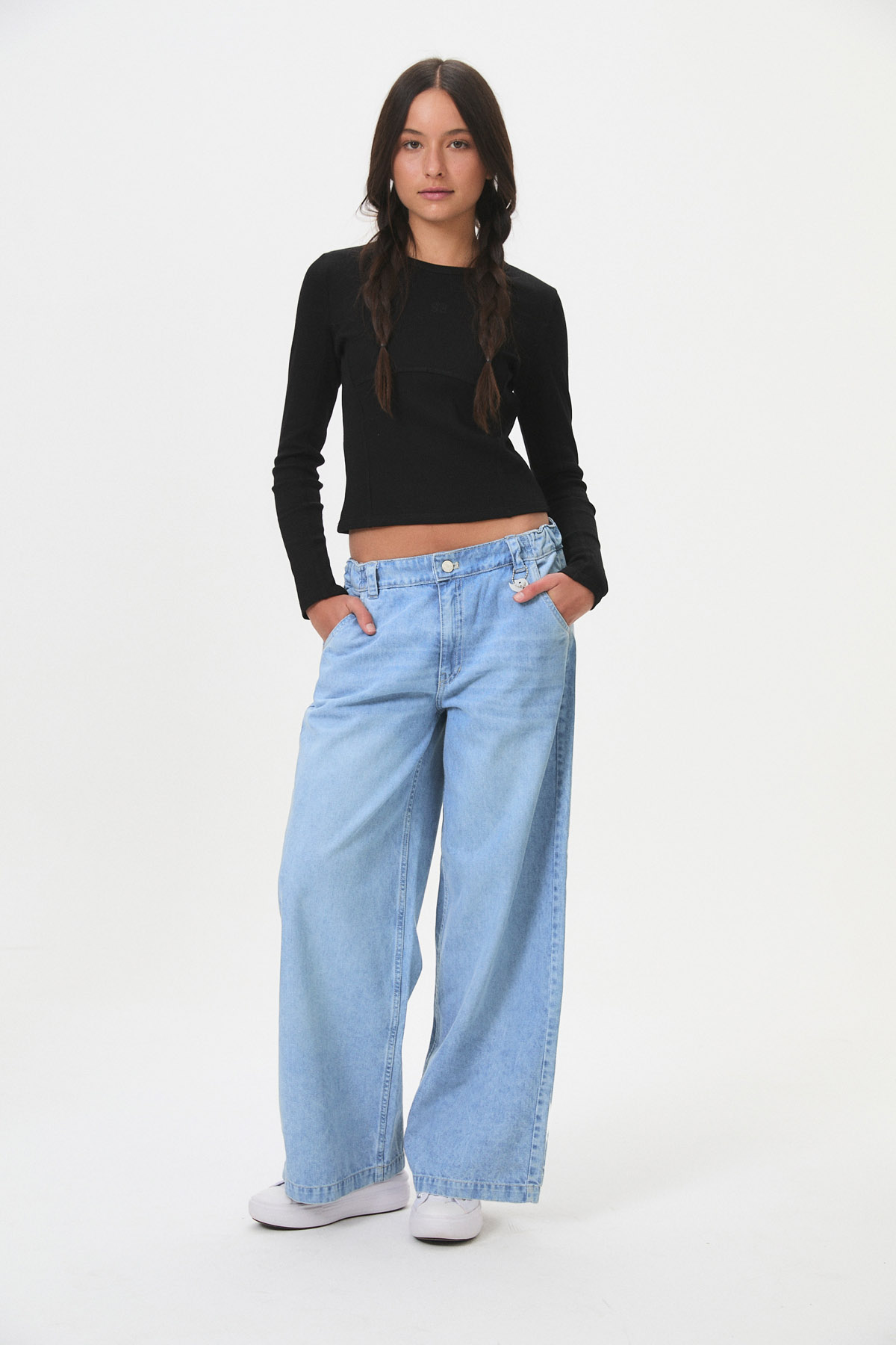 Este pantalón de la cápsula B-DENIM, un continuo de la marca, te ofrece la moda de la temporada con un corte wide leg, ideal para un look desenfadado y cómodo. Confeccionado en denim rígido de 9,2 onzas para asegurar durabilidad y resistencia, incorpora un elástico en la cintura y pinzas en la pierna trasera para un ajuste perfecto y fácil de llevar. La colección se distingue por su variedad de tonos y la versatilidad de sus calces. Además, cuenta con una amplia curva de talles impares diseñada para acompañar a todas las siluetas, y su detalle icónico es el simpático “fantasmita”, que suele encontrarse como llaverito o bordado.