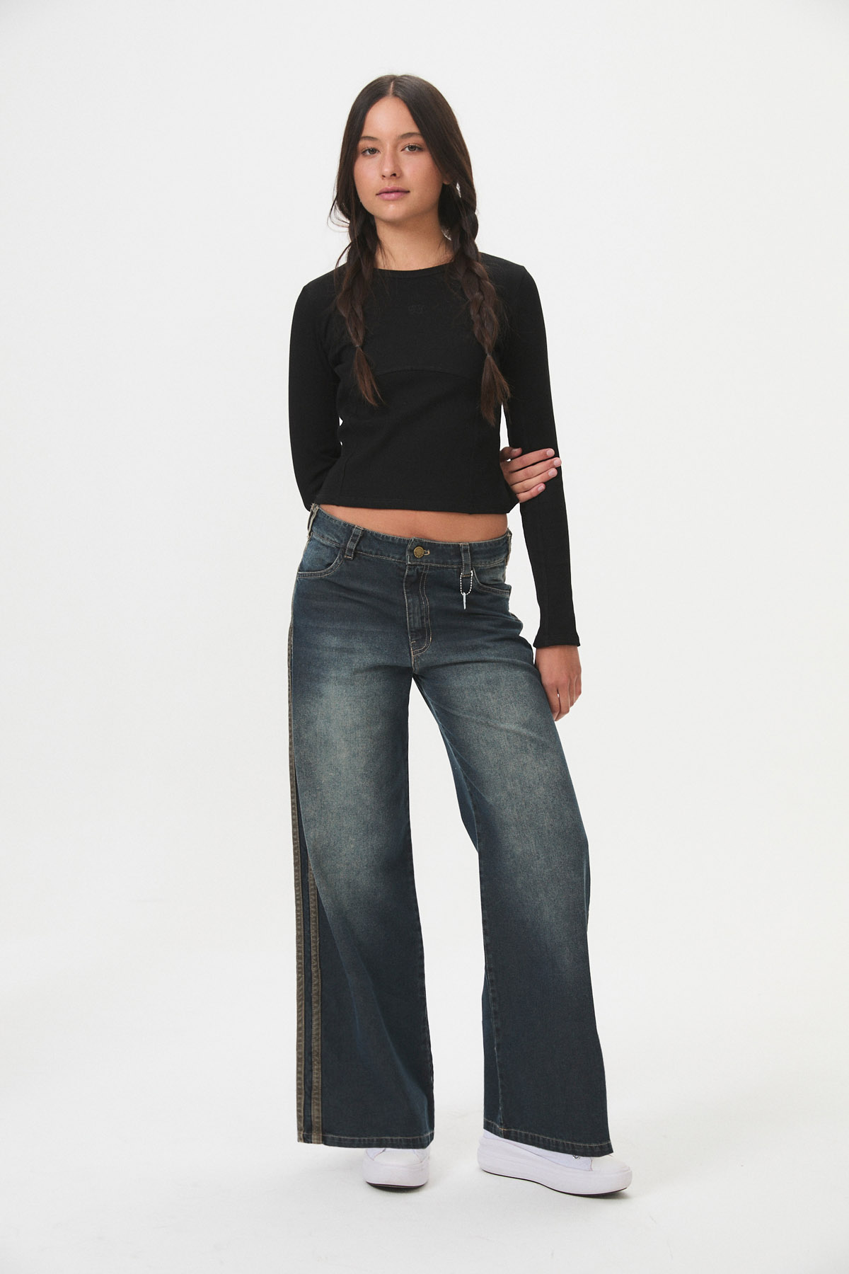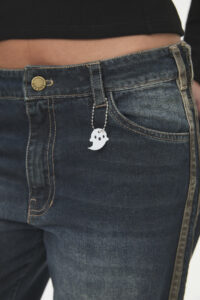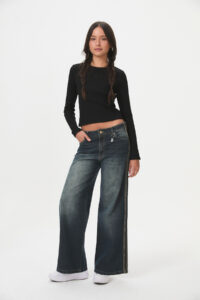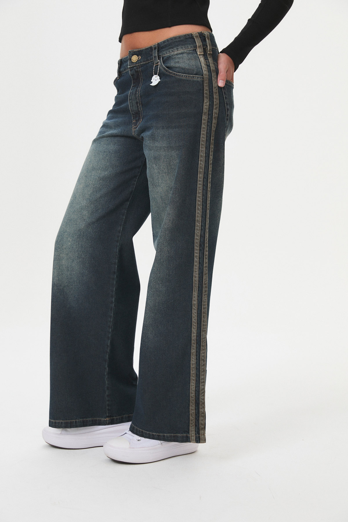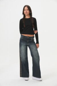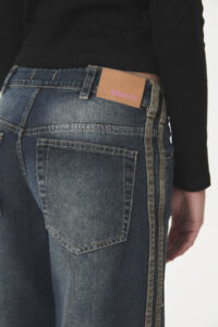 Pantalón de denim rígido, 100% algodón de 9,2 onzas, con un look matizado y un corte moderno “wide leg”. Presenta detalles de tiras contratono en los laterales. Pertenece a la línea B-DENIM, un continuo de la marca que prioriza la durabilidad y versatilidad en lavados y calces, con talles que contemplan distintas figuras (curva de talles impares). Es una prenda cómoda y de tendencia, ideal para el día a día, con un guiño marcario sutil del fantasmita en llavero o bordado.