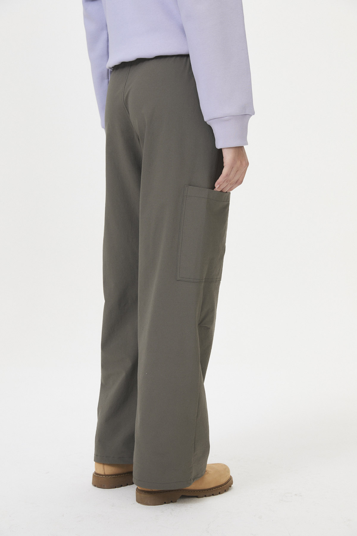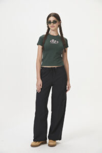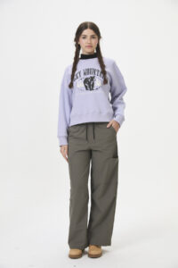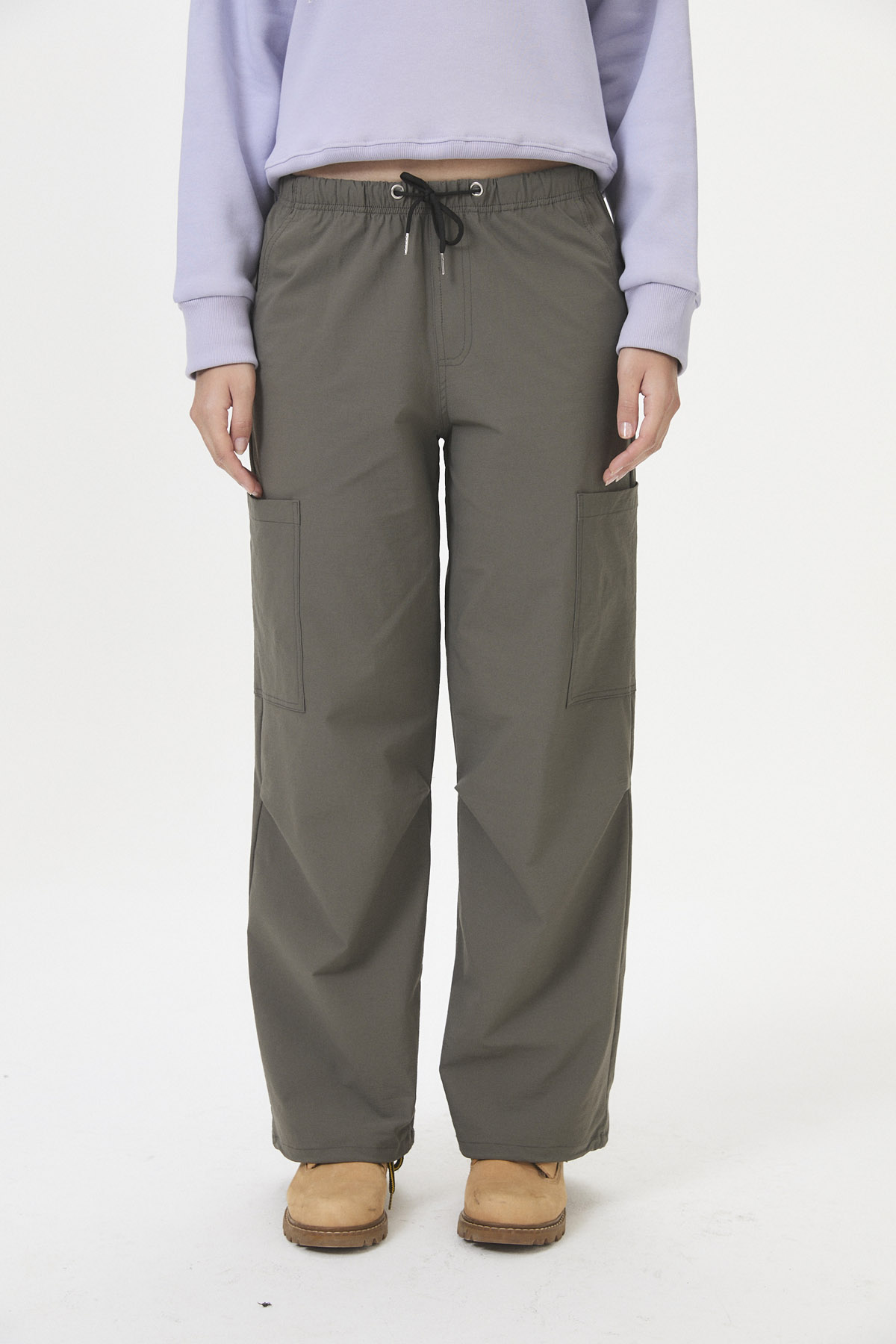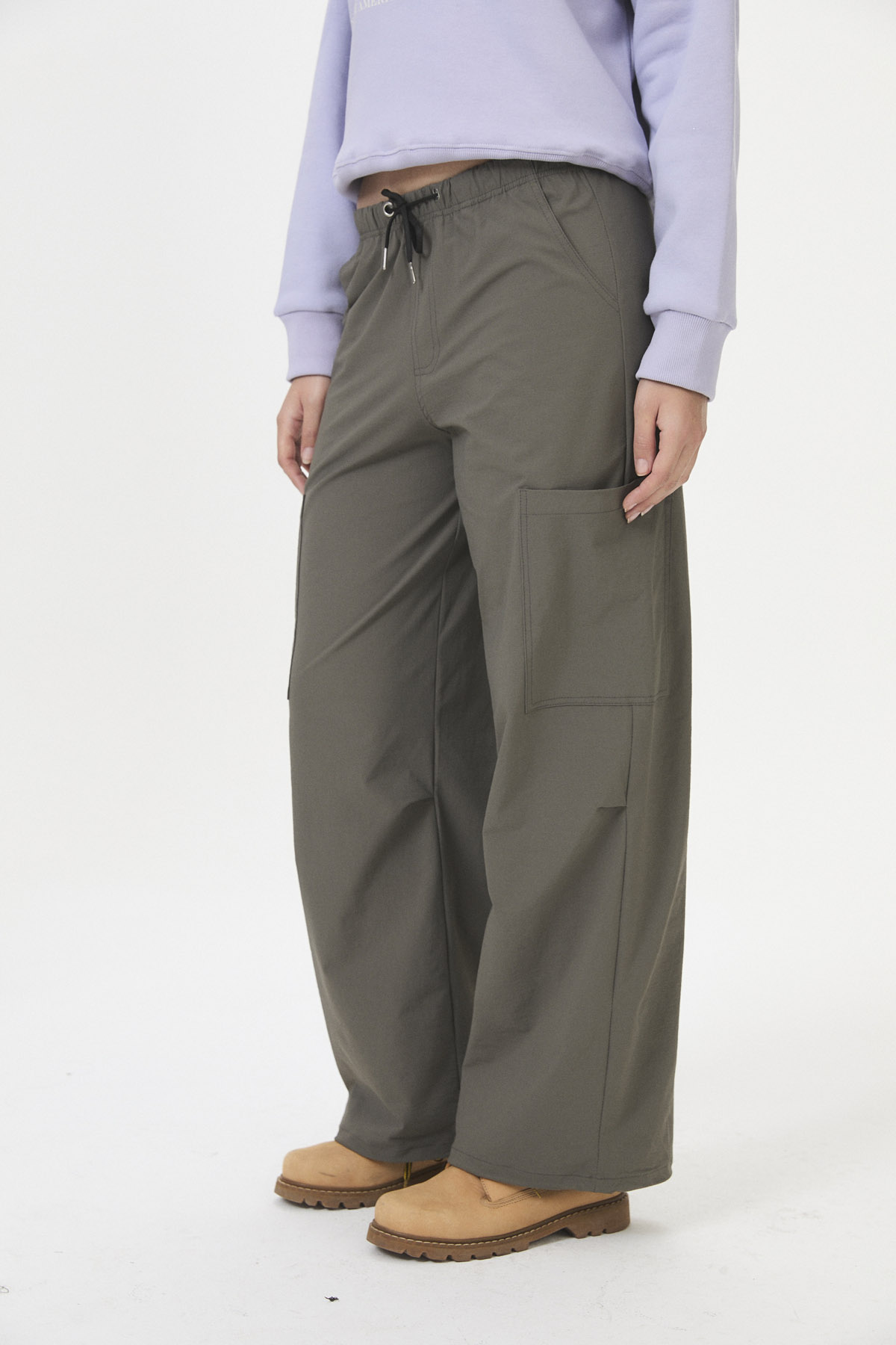 Pantalón tipo babucha de tela plana parachute / plano con elastano (65% nylon, 30% rayon, 6% spandex) diseñado para la colección ROCKY MOUNTAINS. Este estilo urbano con tintes deportivos presenta bolsillos aplicados y pliegues en las piernas, con ajuste elástico y cordón en la cintura, además de la posibilidad de ajuste en las botamangas. Es perfecto para quienes buscan un look inspirado en el estilo snowboard y la comodidad para moverse. Disponible en curva de talles pares.