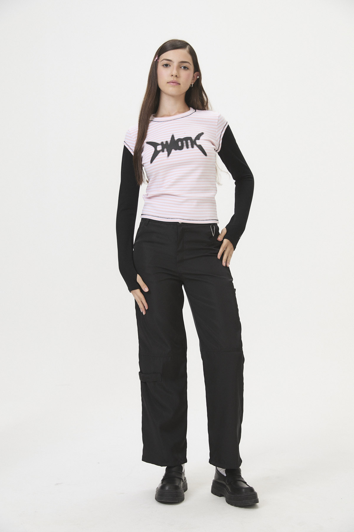 Diseñado para acompañar ese momento de transición y búsqueda de identidad. Este pantalón de corte recto, confeccionado en plano sintético tipo tela de avión (100% poliéster), ofrece comodidad con su elástico en la cintura y recortes en las piernas. Pertenece a la cápsula OUT OF CONTROL, reflejando una estética borrosa e irregular, perfecta para esos días donde todo se siente fuera de control, combinando un estilo urbano con un toque de salida nocturna. Disponible en curva de talles pares.