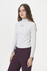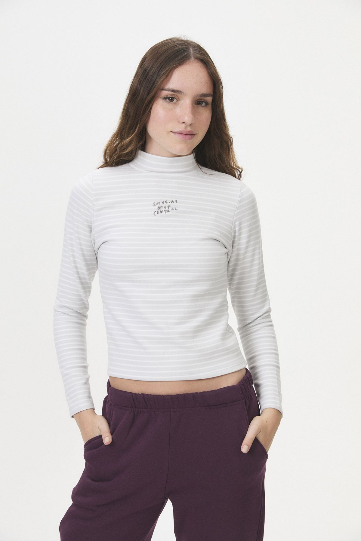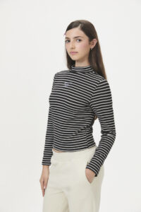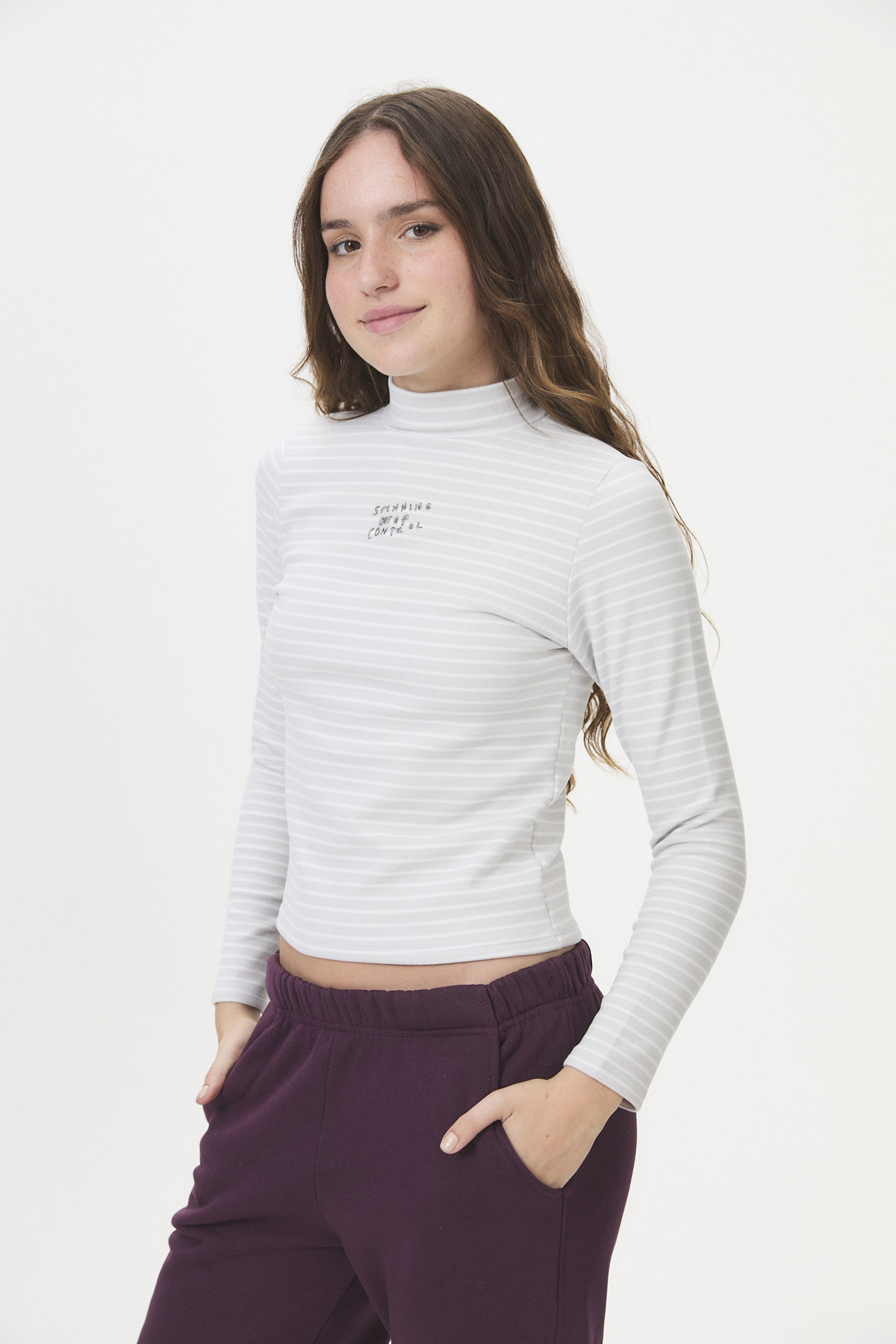 Remera de manga larga, ideal para la transición de temporadas, con un escote medio polo. Confeccionada en un suave tejido rayado tipo “piel de durazno” de suede de punto (92% poliéster, 8% spandex) y un bordado al frente. Pertenece a la cápsula “OUT OF CONTROL”, diseñada para ese momento de búsqueda de identidad, con un mix de estilo urbano y de salida. Disponible en curva de talles pares.