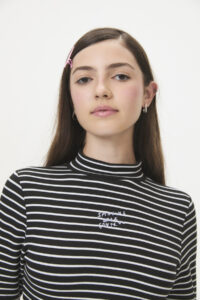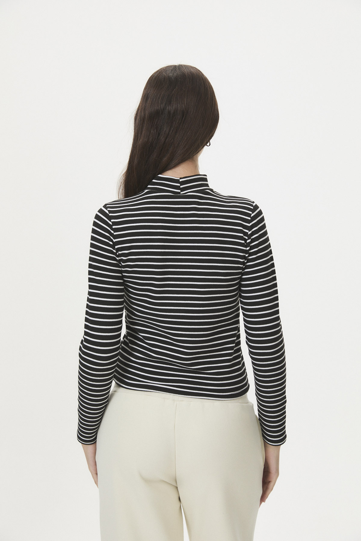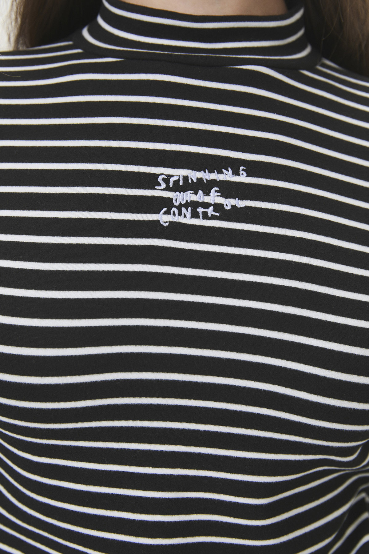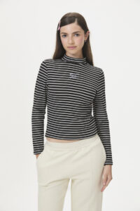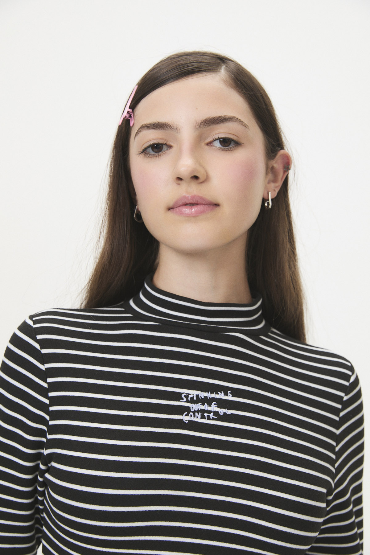 Remera de manga larga, ideal para la transición de temporadas, con un escote medio polo. Confeccionada en un suave tejido rayado tipo “piel de durazno” de suede de punto (92% poliéster, 8% spandex) y un bordado al frente. Pertenece a la cápsula “OUT OF CONTROL”, diseñada para ese momento de búsqueda de identidad, con un mix de estilo urbano y de salida. Disponible en curva de talles pares.