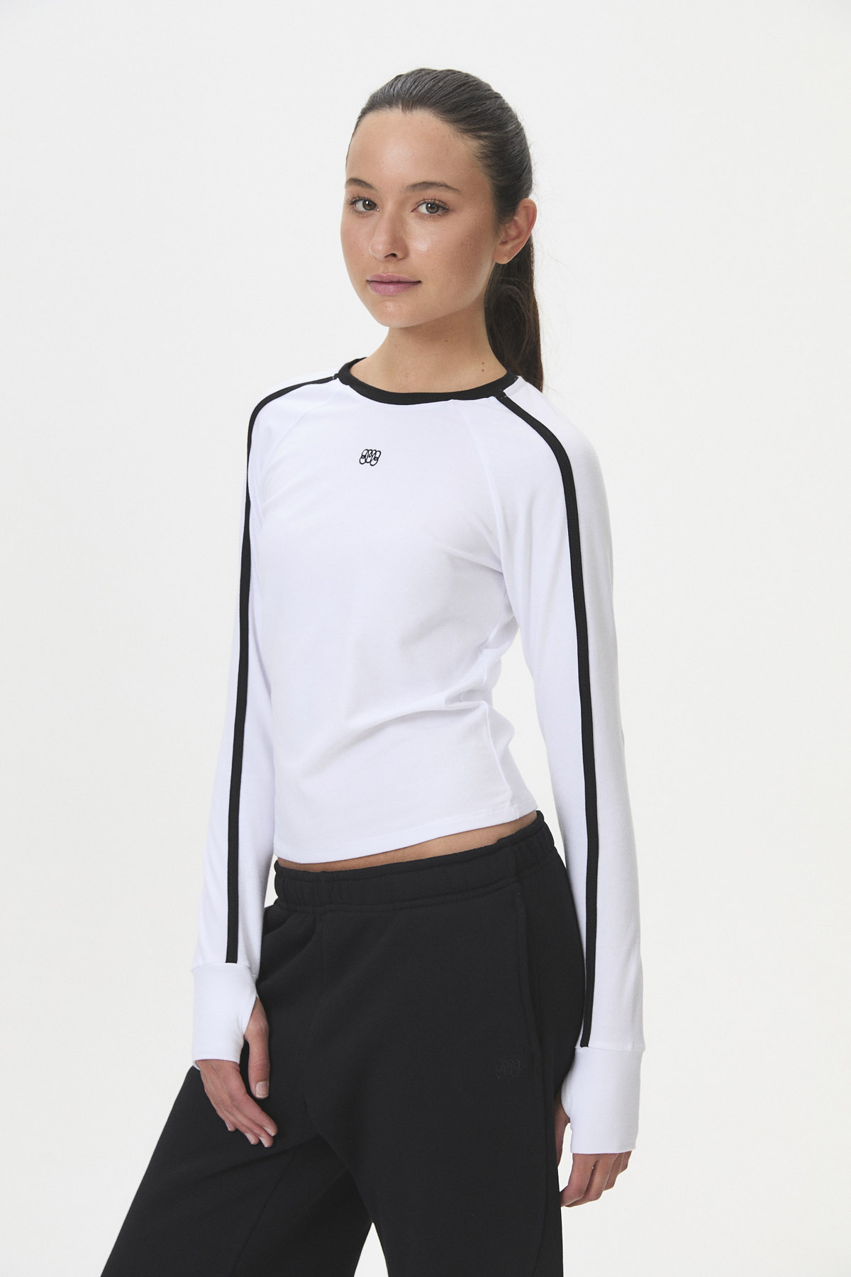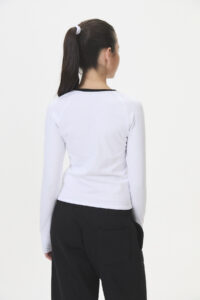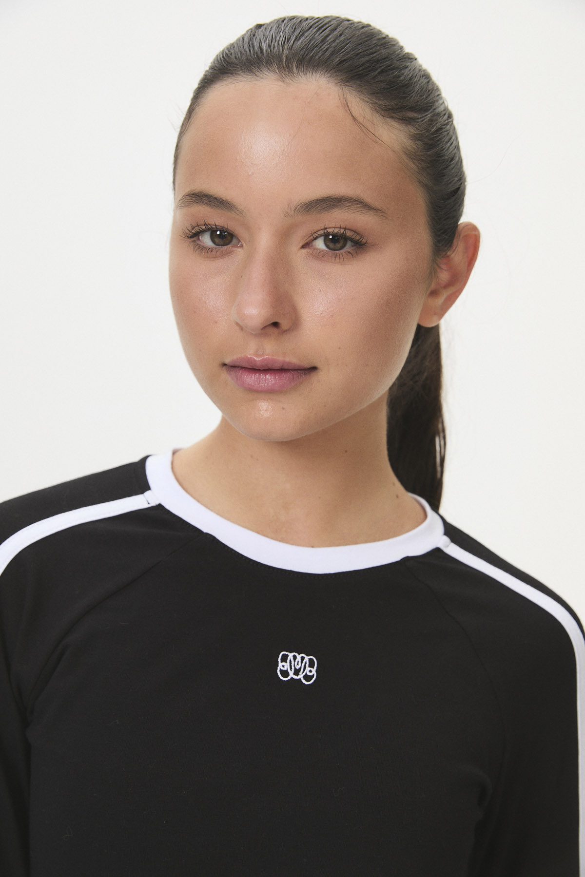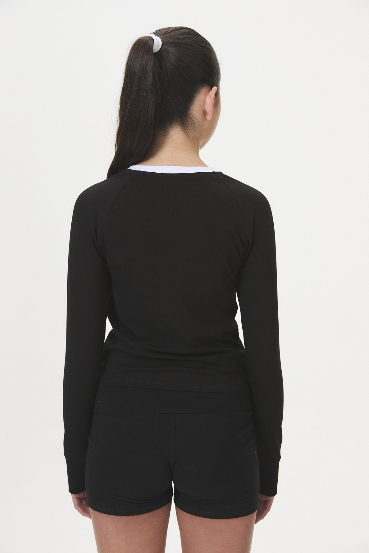 Una prenda básica de manga larga con corte raglán, diseñada para ofrecer máxima comodidad y un calce seguro. Confeccionada en suave jersey con elastano (93% algodón), es amigable con la piel y perfecta para el día a día. Presenta detalles sutiles como una tirilla en contraste y puños con abertura para pasar el dedo, además de no tener etiquetas para evitar molestias. Esta pieza clave combina fácilmente con cualquier otra prenda, destacando por su calidad.