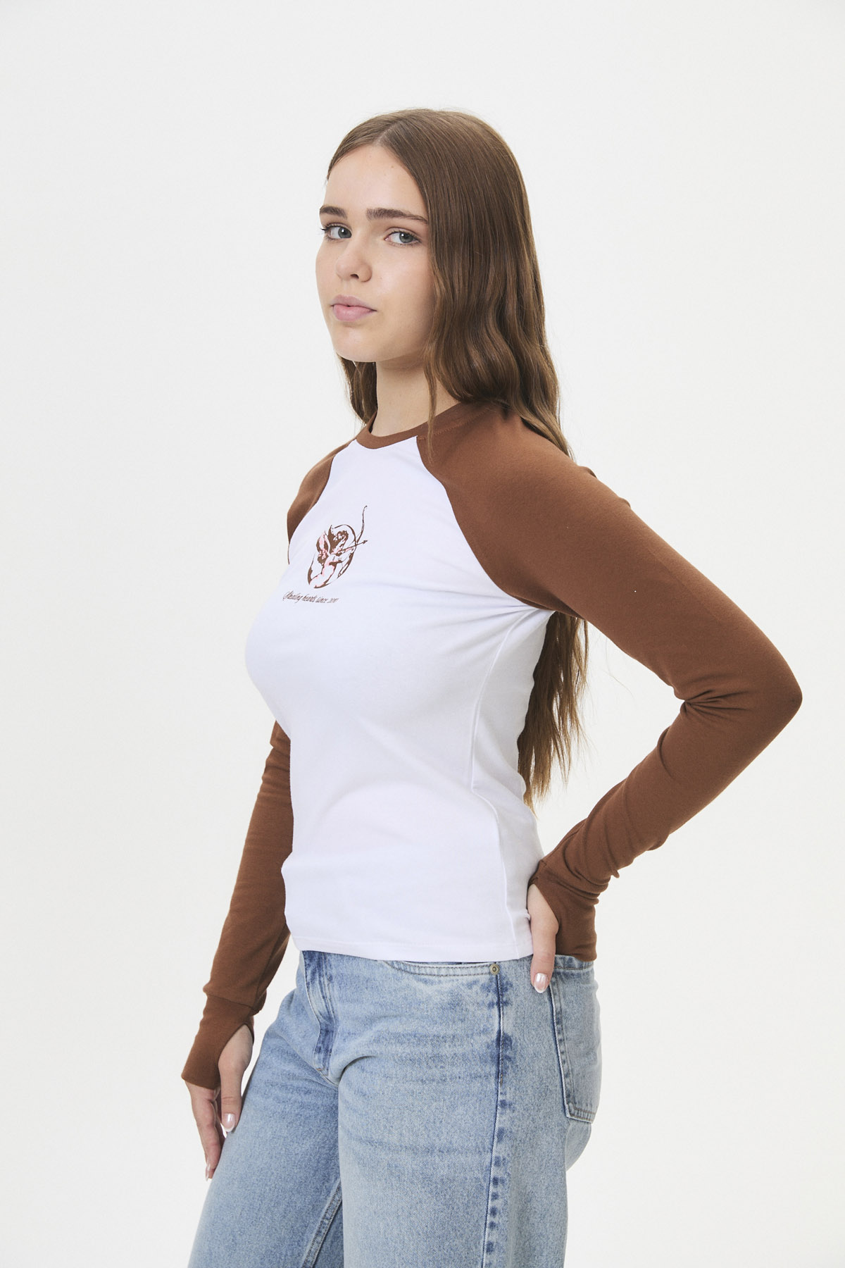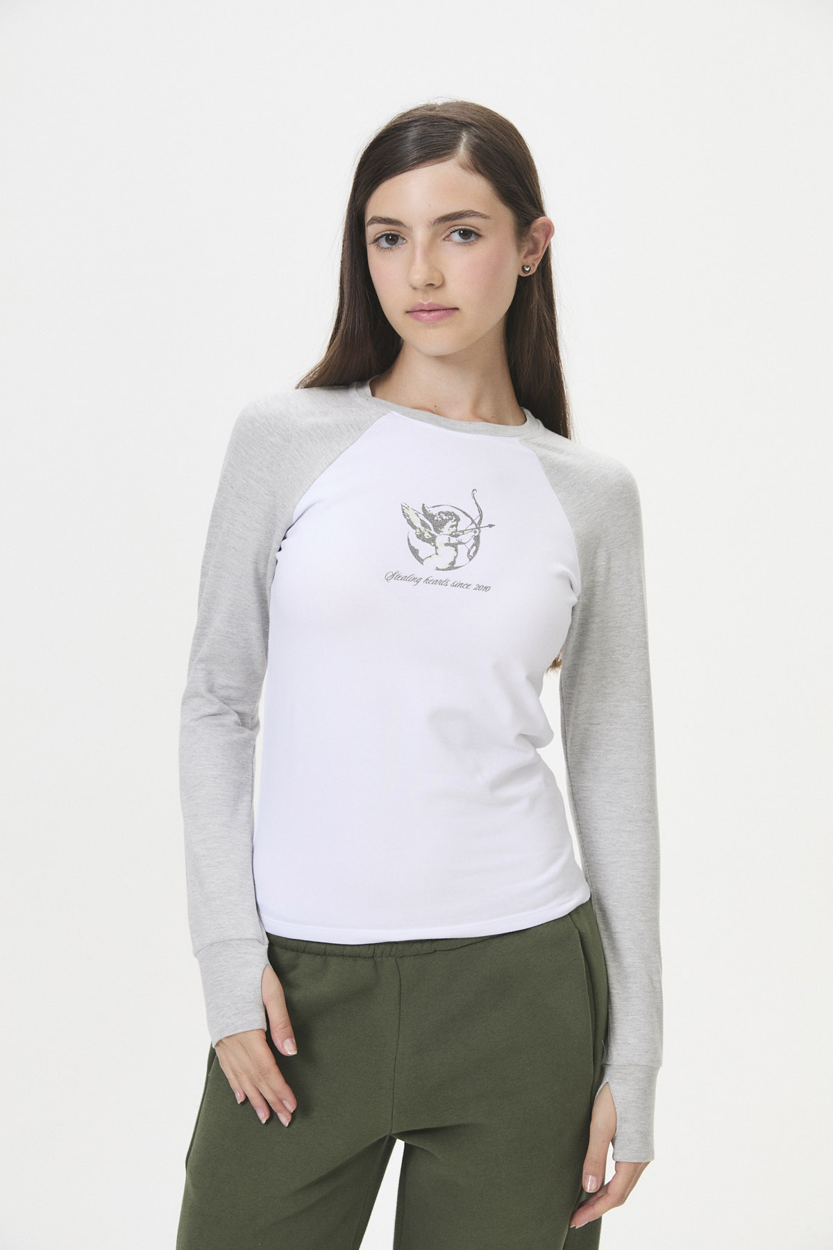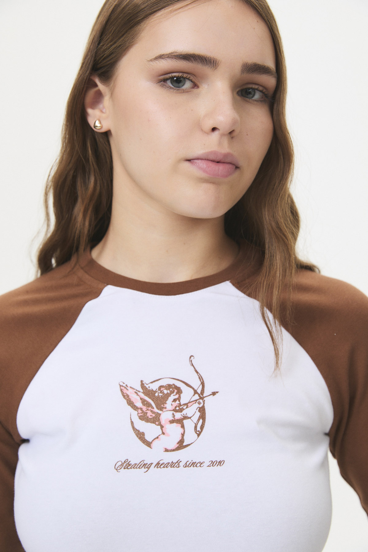 Esta cómoda remera de manga larga con corte raglan, confeccionada en un suave y elástico jersey (93% algodón, 7% elastano), es ideal para el uso diario y para sentirse “comfy”. Su diseño incluye mangas y cuello en contraste, además de una estampa divertida en el delantero. Pertenece a la cápsula “CUPID’S FAV”, con un espíritu un poco más “girly” e inspirado en ese momento de enamoramiento, con frases “negando” el amor y toques tipográficos al estilo “varsity”. Disponible en curva de talles pares.