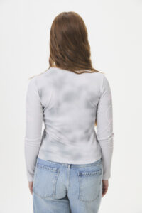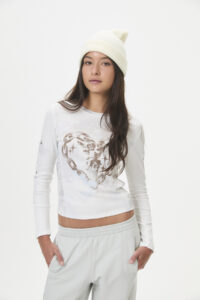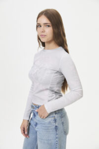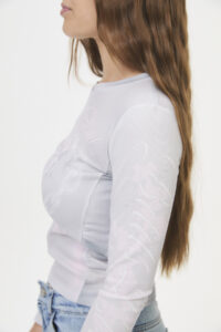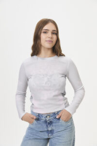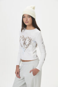 Una prenda de manga larga, confeccionada en morley de basta fina (95% poliéster, 5% spandex), con recortes fruncidos en los laterales y una divertida estampa en el delantero y las mangas. Pertenece a la cápsula “CUPID’S FAV”, inspirada en la incomodidad y la emoción del enamoramiento, con un estilo cómodo, casual y “girly”, ideal para lucir las tallas pares de la curva, reflejando ese momento de emociones nuevas e intensas.
