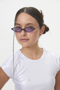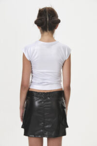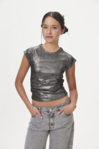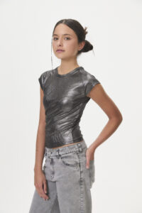Una remera de manga corta, confeccionada en morley con foil (95% poliéster, 5% spandex), que presenta laterales fruncidos y una chapita de marca en la espalda. Su curva de talles pares se alinea con la colección “OUT OF CONTROL”, diseñada para acompañar ese momento de búsqueda de identidad propia y la sensación de que todo se siente fuera de control durante la transición entre lo urbano y el momento de salida, reflejando el deseo de libertad en esta etapa de cambios. Es una prenda de transición, perfecta para quienes están dejando la infancia y entrando en la adolescencia.