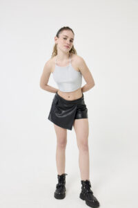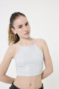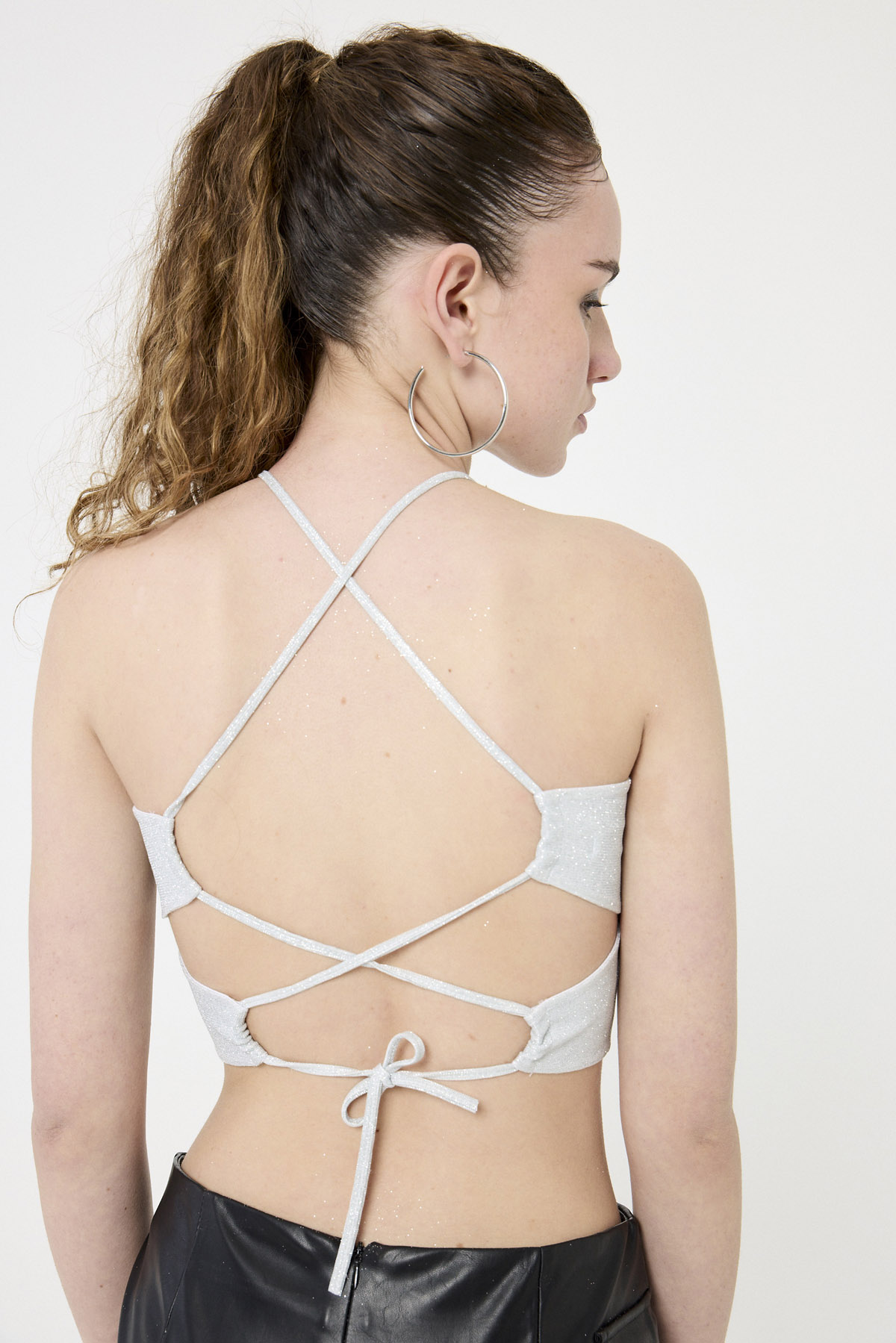 UN TOP HALTER CON ESPALDA CRUZADA CON TIRITAS PARA ATAR, EN TELA CON LUREX PLATA EXTRA SUAVE.