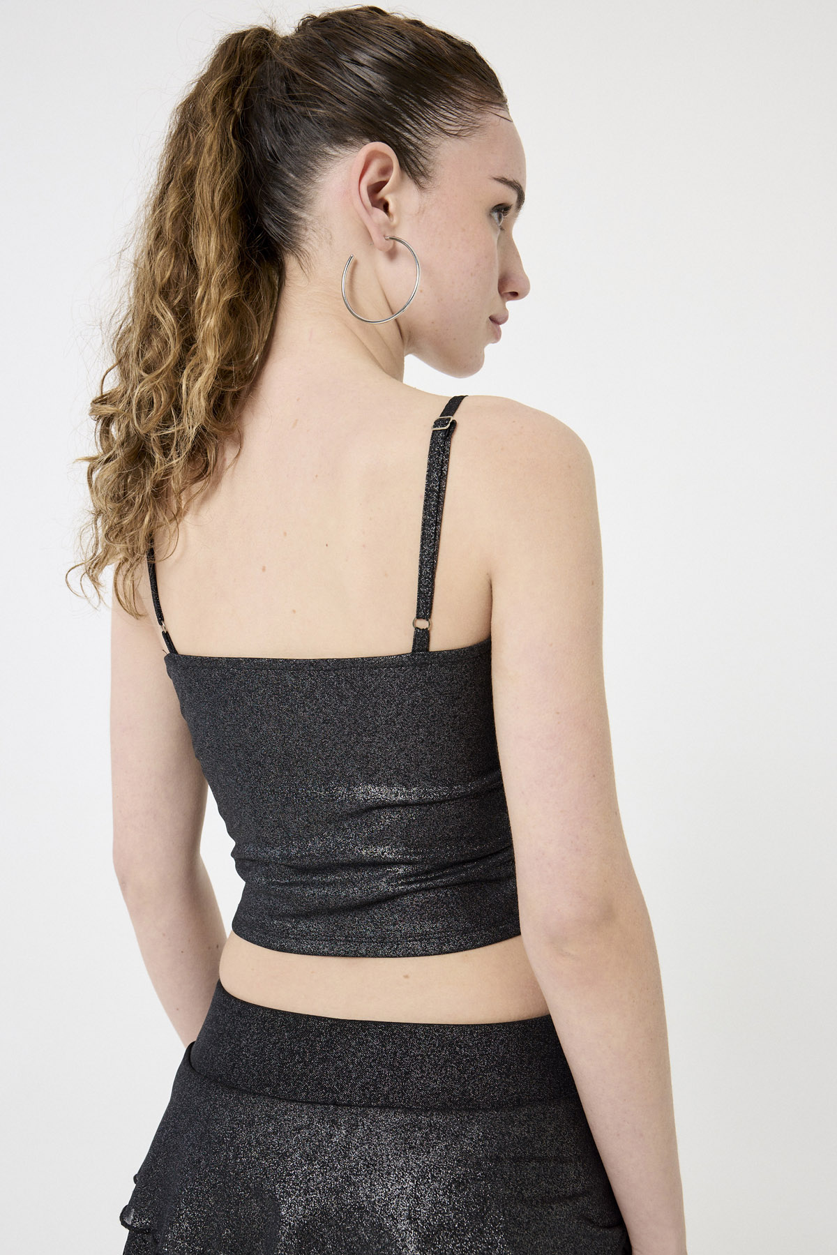 UN TOP EN MESH FOIL Y JERSEY CON ELASTANO DE ESCOTE RECTO CON BRETELES FINITOS REGULABLES Y FRUNCES EN LATERALES.